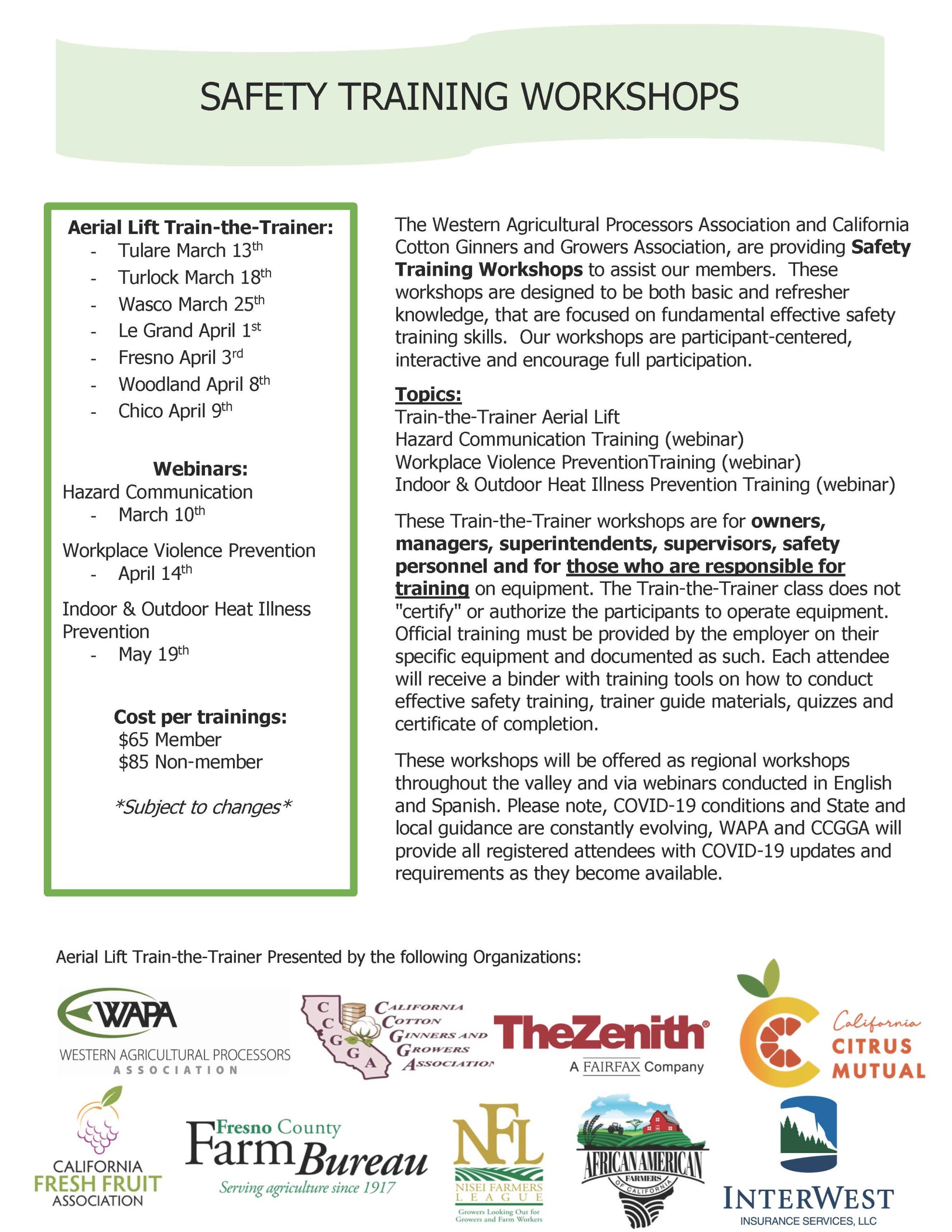 California Cotton Ginners and Growers Association and Western Tree Nut Association are offering safety training workshops in both Spanish and English. Topics include: