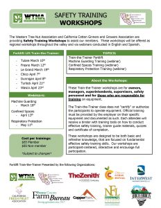 Beginning in March, the Forklift Train-the-Trainer workshops will be held in the following locations: Fresno, Tulare, Wasco, Le Grand, Turlock, and two additional locations in Dunnigan and Chico.