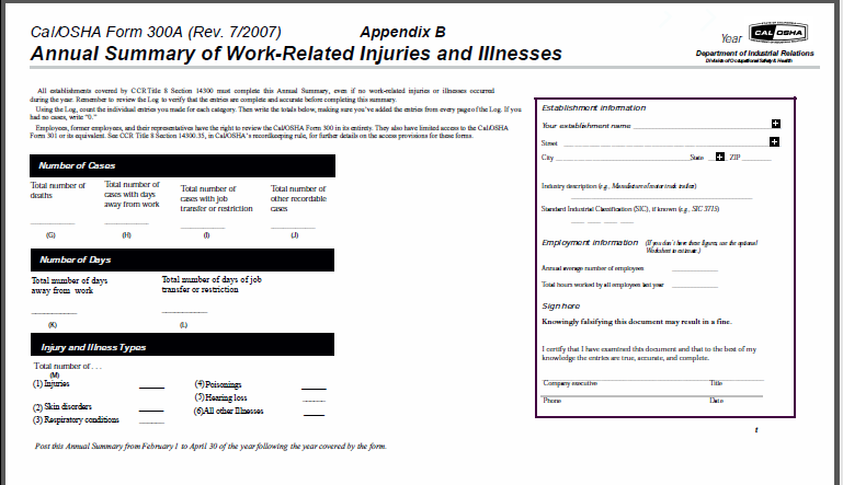 Click for Cal Osha Form 300A (Annual Summary of Work-Related Injuries and Illnesses)