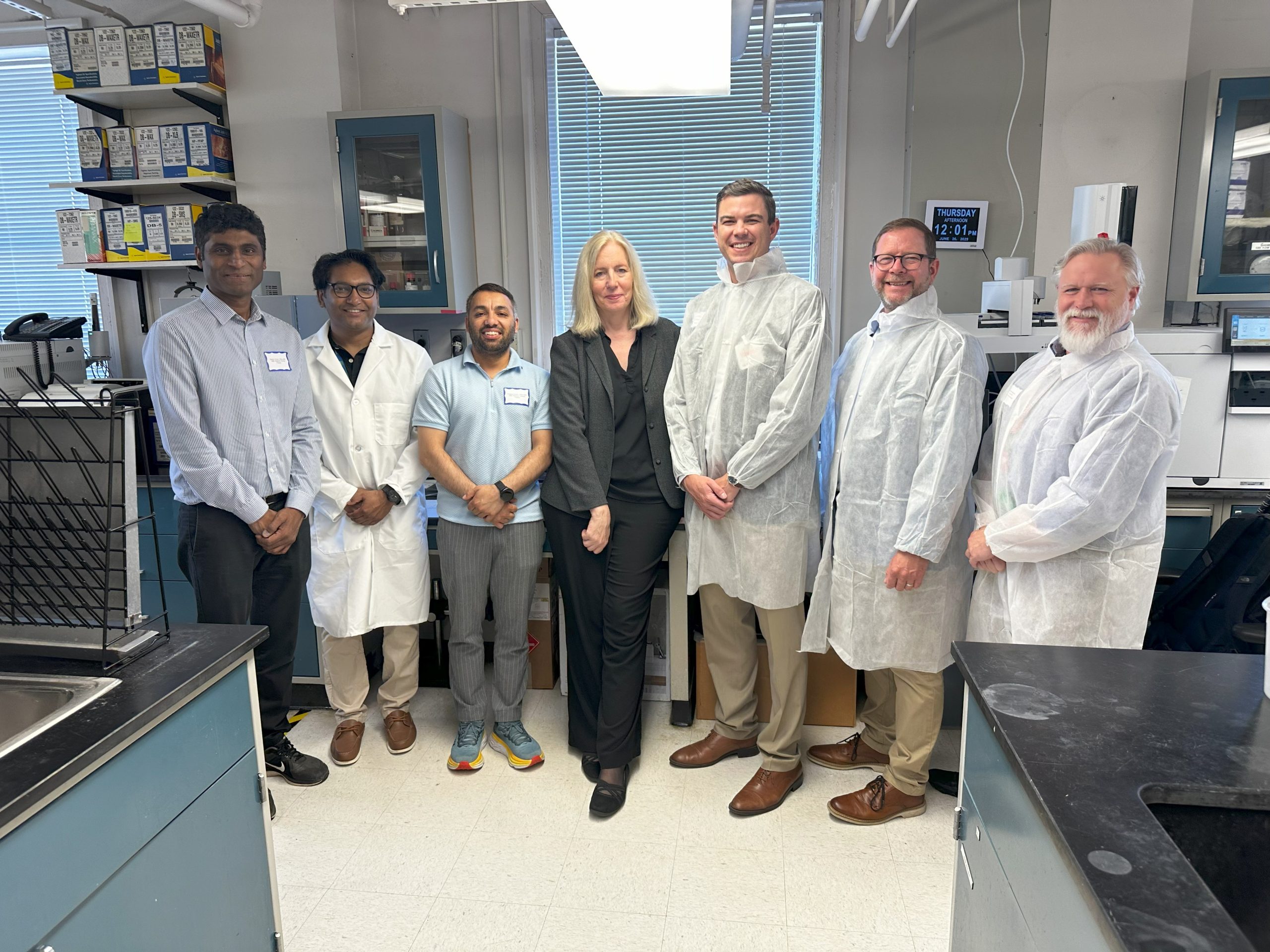 After the discussion, attendees were then led to the research lab, where ongoing pheromone research is being conducted. With only an area of 93 square feet for a containment lab, Dr. Aijun Zhang, Research Chemist with USDA-ARS and his research assistants Dr. Mohamed Ahmed, Dr. Saveer Ahmed, and Dr. Souvic Sarker, maintain a colony of Cotton Seed Bugs, and conduct testing on attractants that could be used in future lures. Squeezing into the room 4 at a time, researchers showed the various equipment and tests examples that individual bugs are subject to in order to test efficacy. Dr. Aijun is hopeful that a patented lure will be available by the end of July, and can be paired with traps in areas where Seed Bug has been detected to keep them out of commercial cotton fields. Stay tuned for more updates.
