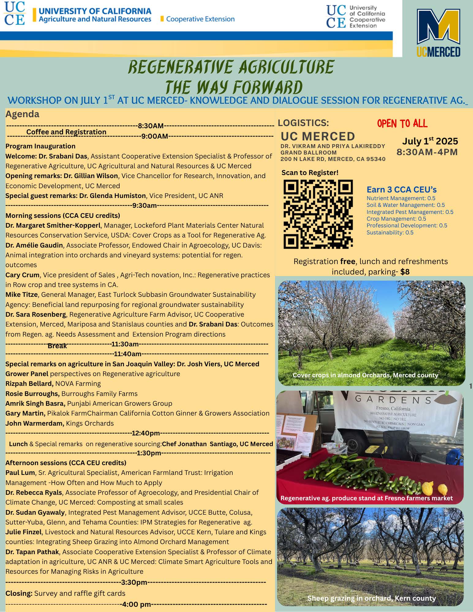 Make time now to join the Regenerative Agriculture: The Way Forward workshop on Tuesday, July 1st at UC Merced on knowledge and a dialogue session on regenerative agriculture. The workshop will be from 8:30 AM to 4:00 PM and registration is free! It will include talks from researchers and people from the industry, as well as a farmer panel to discuss their perspectives and thoughts on regenerative agriculture. Lunch and refreshments are included. Registration sign-up is linked here. For more information, please see the flyer below.