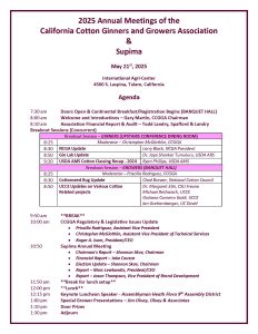 The California Cotton Ginners and Growers Association’s 2025 Annual Meeting in conjunction with Supima will be held on Wednesday, May 21st at the International Agri-Center in Tulare, CA. Registration and Continental Breakfast will begin at 7:30 am. The program will begin with Breakout Sessions at 8:30 am and will end with lunch.