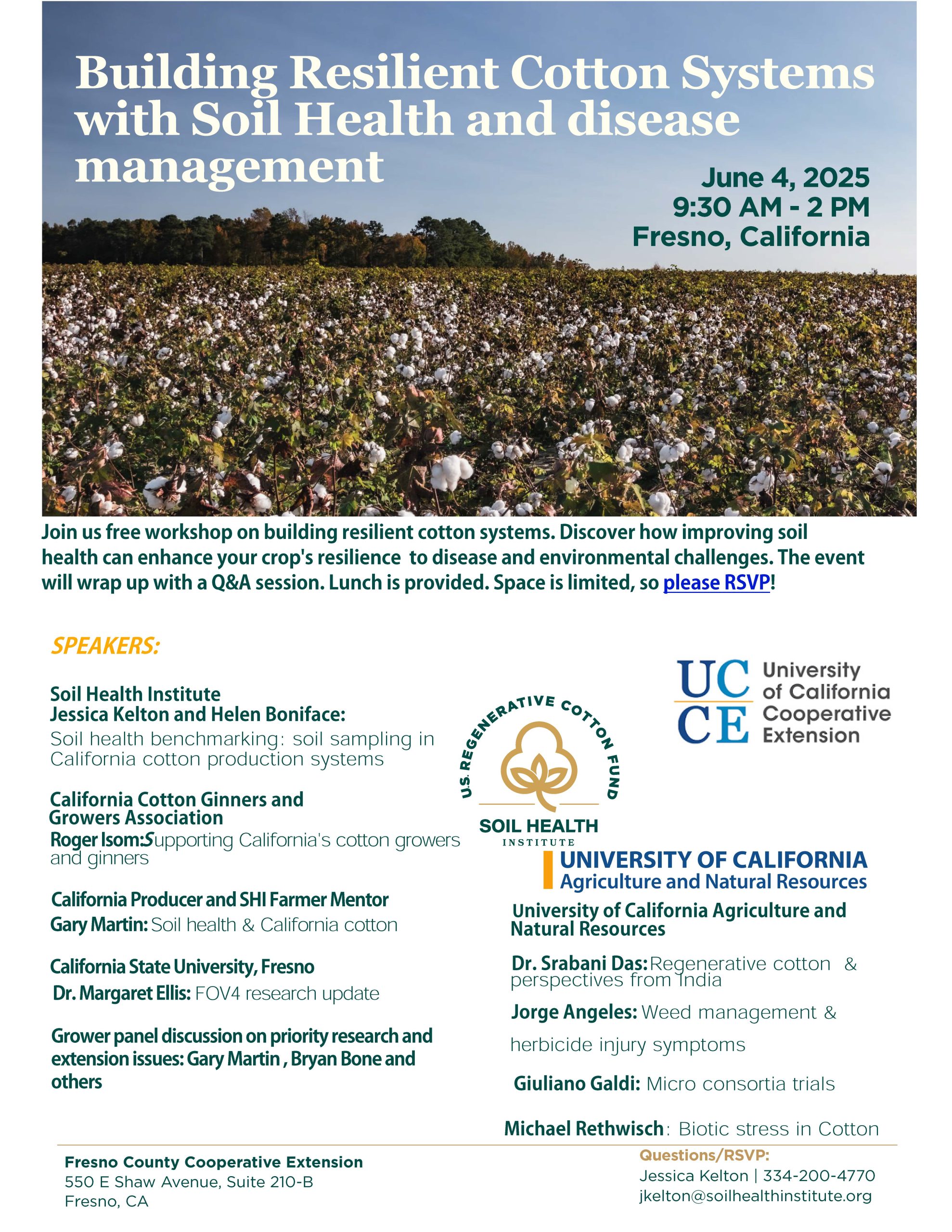 SHI-UCCE California Cotton Workshop: Soil Health and Disease Management on June 4th, UCCE Fresno