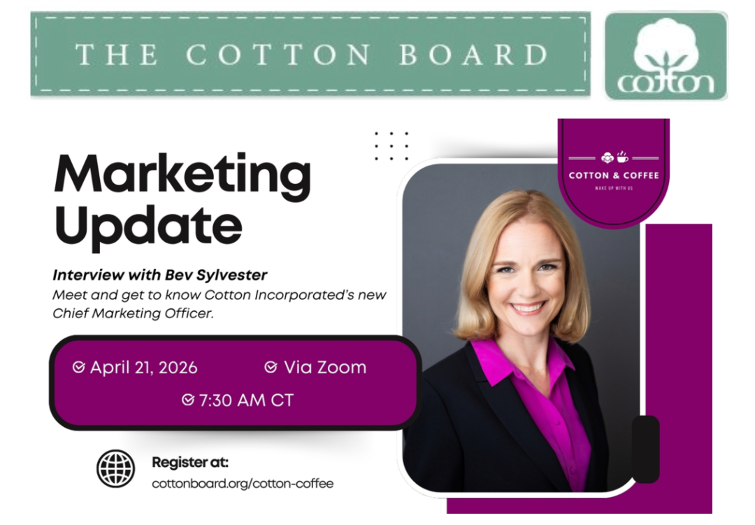 Cotton Incorporated is taking a fresh approach to marketing, one that sharpens its focus, modernizes outreach, and better supports cotton throughout the supply chain. This new strategy is designed to strengthen cotton’s competitiveness and drive meaningful impact for the industry. Join us for Cotton & Coffee on April 21st as we explore the updated marketing approach and what it means for stakeholders of the Cotton Research & Promotion Program.