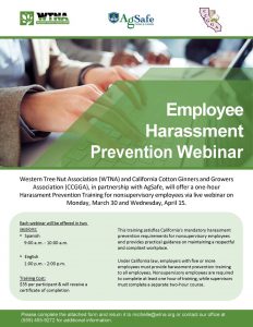 Last month, the California Cotton Ginners and Growers Association (CCGGA) and Western Tree Nut Association (WTNA), in partnership with AgSafe, held a one-hour Harassment Prevention Training for nonsupervisory employees via live webinar. This week they will be offering another training via live webinar on Wednesday, April 15. The webinar will be offered in two sessions: