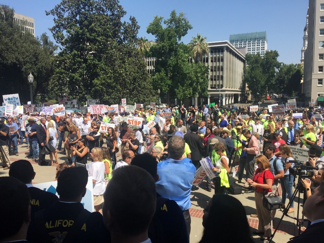 Over 1,000 farmers, farmworkers, business owners, teachers, medical agency staff, students and elected officials showed up at the Capitol to protest the “State Water Grab” contained in the State Water Resources Control Board’s (SWRCB) proposed Water Quality Control Plan for the San Francisco Bay/Sacramento-San Joaquin Delta Estuary (the “Bay-Delta Plan”) and the supporting proposed final Substitute Environmental Document (“Final SED”). The proposal would require “unimpaired flows” on the Stanislaus, Tuolumne and Merced rivers during critical times of the year, which would ultimately mean a loss of 40% to 60% of the water used those areas. This will be devastating not only to agriculture but to everything in Merced, Stanislaus and San Joaquin Counties. In interviews following the Rally, Association President/CEO Roger Isom, who participated in the Water Rally, stated “this is not only a water grab, it is a clear signal that the State Water Board has no consideration for life in the San Joaquin Valley. Anyone who questions that should look no further to the west side of the San Joaquin Valley devastated by similar measures that eliminated water coming to that area. Fresno County went from being the number one cotton producing county in the world to outside of the top 100. More than 20 cotton gins and the over 1,000 people involved in those operations lost their jobs, and the populations of salmon and delta smelt are no better off today, then they were back then. This new proposal will have the same impact to the economies of Merced, Stanislaus and San Joaquin counties and towns like Denair and Ballico will look like Mendota and Firebaugh. Today is the day we stand up and say enough is enough. And today the state’s agricultural industry did just that!”