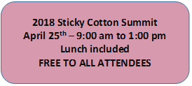 The cotton industry in California is faced with a critical issue, and that is the continued presence of sticky cotton. We have discussed this issue many times, and brought it to the forefront last year in our first ever Sticky Cotton Summit. We walked away from that meeting with several action items, and now it’s time to see where we are. The cotton industry in California can ill afford to be labeled with sticky cotton. Our Board of Directors has called for an update on where we are on those action items. This important meeting will be the 2018 CCGGA Sticky Cotton Summit and will be held on Wednesday, April 25th at the Wyndham Garden Fresno Airport Hotel in Fresno. Registration and Continental Breakfast will begin at 8:30 am. The actual program will begin at 9:00 am and will end with lunch. This event is FREE; however registration is REQUIRED in order to provide us with an accurate count for room and lunch needs. You may register online at https://2018stickycottonsummit.eventbrite.com or you can call our offices at (559) 252-0684.