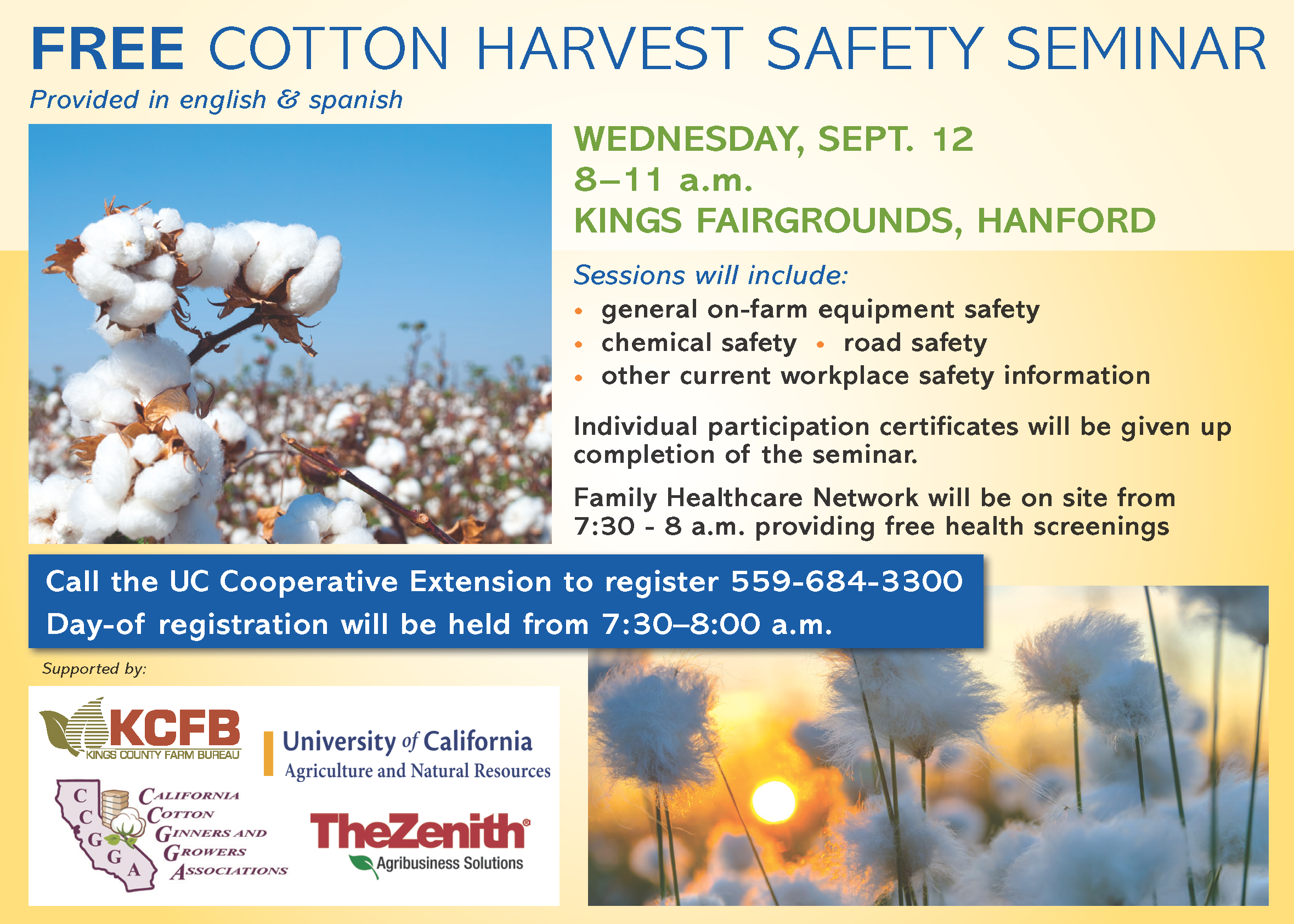 A FREE Cotton Harvest Safety Seminar will be held September 12th from 8-11 a.m. at the Kings Fairgrounds in Hanford. The sessions will include general equipment safety, chemical safety, road safety, and much more! To register, call the UC Cooperative Extension at 559-684-3300 or register the day-of from 7:30-8:00 a.m.